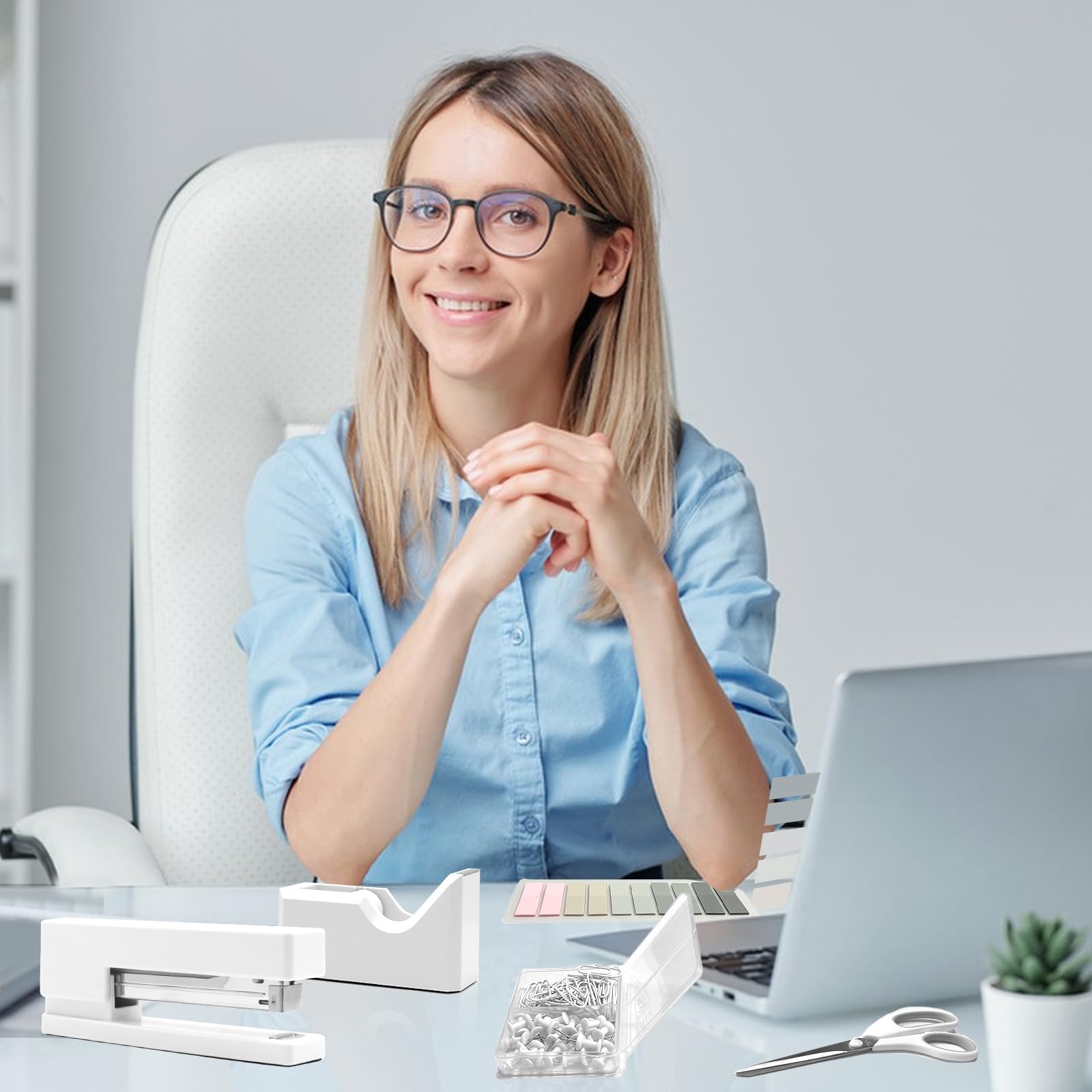 - PACKAGE INCLUDES - This White office supplies contains 1x 6.1inch Stapler , 1x Staple Remover, 1000x Staples, 1x Tape Dispenser, 1x Office Scissor, 20x Push pins, 40x Paper Clips, 10 colors Index Tabs. Such a complete White desk accessories combination can meet your daily office and study needs.